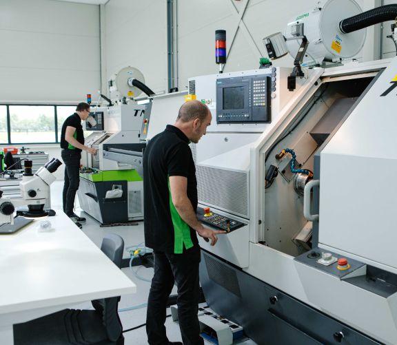 Langrehen ist eine in der Schweiz entwickelte Technik für die Feinmechanik, mit der Produkte mit kleinsten Durchmessern so genau wie möglich und in großer Anzahl gedreht werden können. Bei dieser Technik bewegt sich der Meißel nicht, sondern das Material selbst bewegt sich durch die Spindel. Der Vorteil dieser Methode ist, dass der Meißel immer so nah wie möglich an der Spindel schneidet. Infolgedessen biegt sich das Material unter dem Meißeldruck am wenigsten. In Exakt verwenden wir die langen Drehmaschinen Tornos Nano und Micro. Diese Maschinen zeichnen sich durch eine extrem hohe Genauigkeit und Standzeit aus. Je länger sie nacheinander laufen, desto flacher sind die Toleranzen. Kurzum: Juwelen von Maschinen.