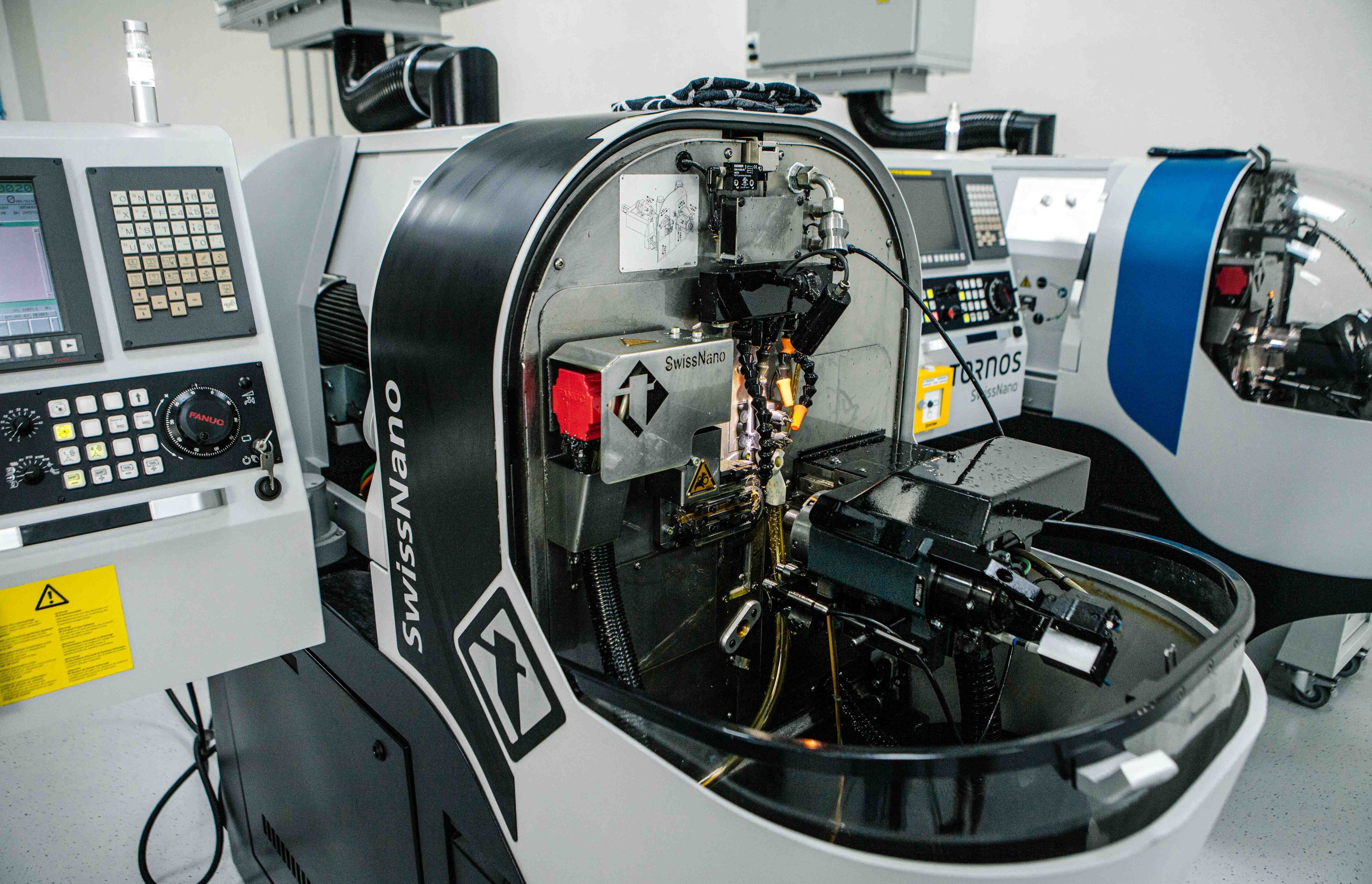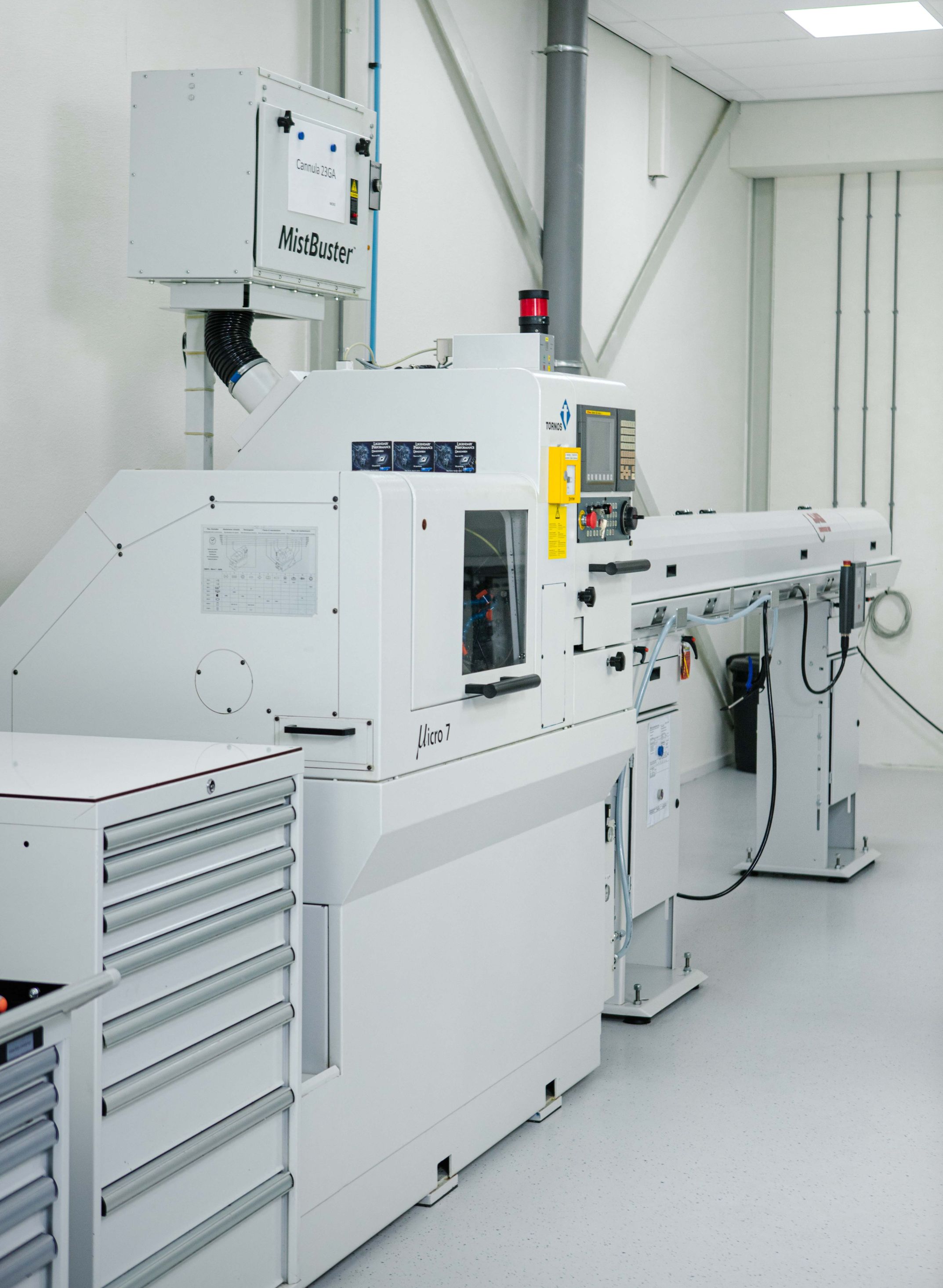 Langdraaien is een techniek die in Zwitserland is ontwikkeld voor de fijnmechanika, waarmee producten met de kleinste diameters zo nauwkeurig mogelijk en in groten getale gedraaid kunnen worden. Bij deze techniek beweegt niet de beitel, maar het materiaal zelf door de spindel heen. Het voordeel van deze methode is dat de beitel altijd zo dicht mogelijk op de spindel snijdt. Het materiaal buigt hierdoor het minste onder de beiteldruk. Binnen Exakt maken wij gebruik van de langdraaibanken Tornos Nano en Micro. Deze machines kenmerken zich door hun uiterst hoge nauwkeurigheid en standtijd. Hoe langer ze achter elkaar draaien, hoe vlakker de toleranties. Kortom: juweeltjes van machines.
